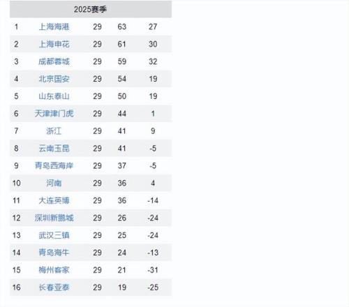 中超最新积分榜