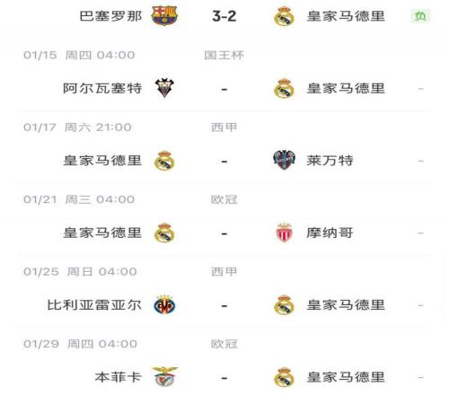 目前皇马在联赛积45分排名第2,落后榜首的巴萨4分。昨日凌晨进行的西超杯决赛中,皇马2-3不敌巴萨。